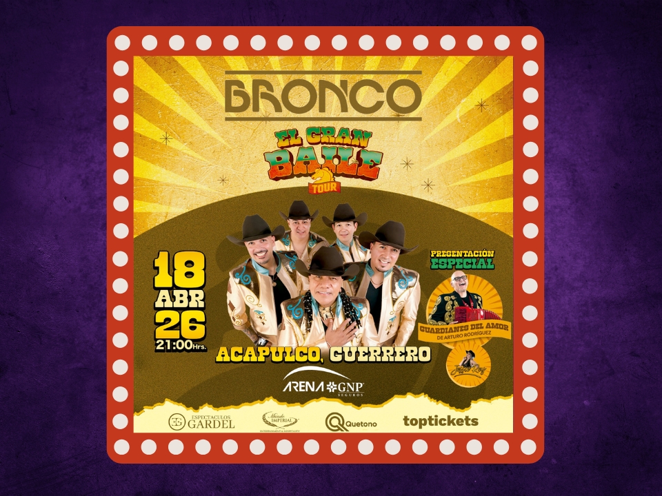 Bronco llega a Acapulco el 18 de abril 2026 con su Tour El Gran Baile en Arena GNP. Compra boletos en Superboletos y taquilla oficial.
